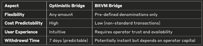 BitVM's workaround involves off-chain computation with on-chain verification, enabling trust-minimized (not trustless) BTC bridging. Following optimistic design principles, execution is assumed correct unless proven otherwise—but the implementation differences create vastly different user experiences.