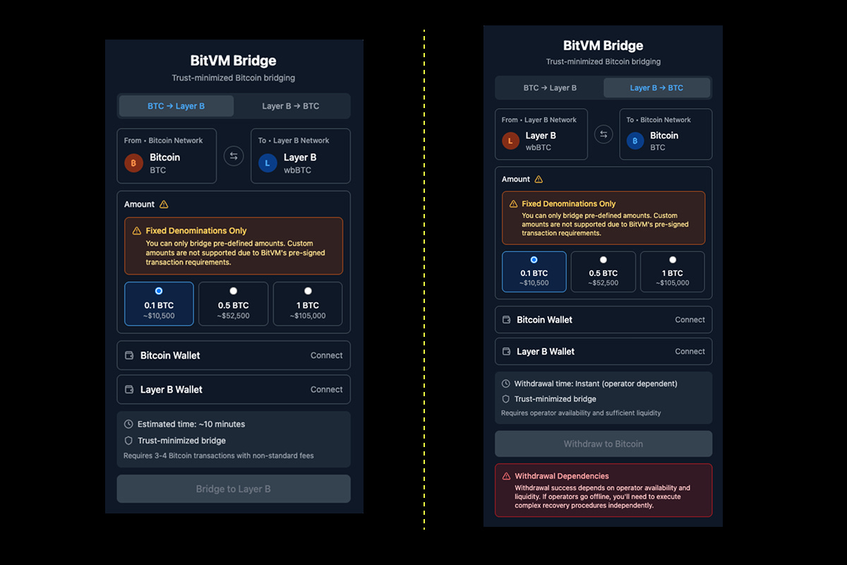 I've discussed the BitVM bridge experience extensively in previous posts, so I won't repeat the detailed analysis here. Instead, refer to the interactive mock interface below that demonstrates the key limitations and user experience challenges inherent to BitVM's design.